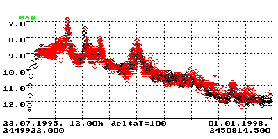 V723 Cas / Nova 1995: Beobachtungen aus der BAV (rot) und aus dem VSNET (schwarz)