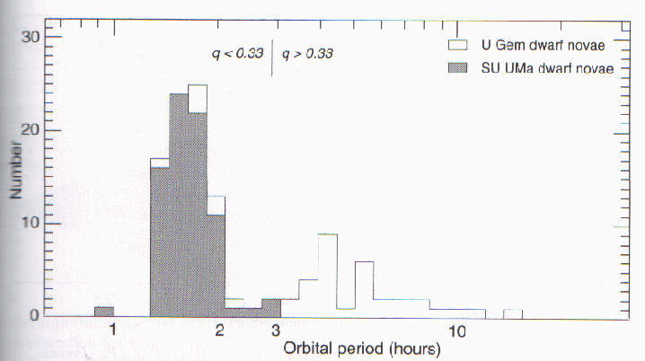 Das Masseverhältnis begrenzt zwei Arten von Zwergnovae, deren Verteilung bezüglich der Orbitalperiode in Abbildung 3 dargestellt ist: SU-UMa-Sterne haben maximale Bahnperioden von etwa drei Stunden, während U-Gem-Sterne oberhalb dieser Grenze liegen. Bei U-Gem-Sternen mit niedrigeren Bahnperioden handelt es sich vermutlich um Sterne mit noch nicht entdeckten Superbuckeln. Die Grenze stimmt ungefähr mit der Periodenlücke überein, die im Bereich von zwei bis drei Stunden liegt.